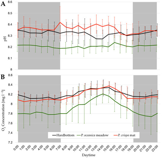 Daily cycles of water parameters measured on Site PC2 in Phyllophora crispa mat (red), Posidonia oceanica meadow (green), and bare rock bottom as reference (black). (A) pH and (B) oxygen concentration (mg L−1), measured at the bottom of the respective habitat. Error bars indicate standard deviation, grey areas indicate dark phases.