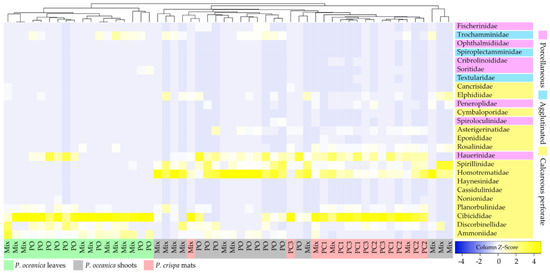 Hierarchical clustering (average linkage, Spearman ranked correlation) of family abundances among sites (individuals per m2) found in Phyllophora crispa (red) and Posidonia oceanica habitat sites (green = leaf; grey = shoot). Test types are indicated as purple (porcellaneaus), blue (agglutinated) and yellow (calcareous perforate). The Z-score indicates the distance to the mean, which is indicated as “0”.