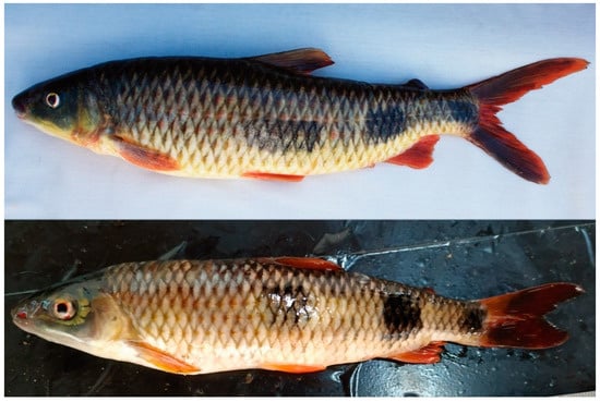 - Costa, A.P.R. Aspectos da biologia reprodutiva de fêmeas do Piau-vermelho Leporinus copelandii Steindachner, 1875 (Pisces, Anostomidae), na bacia do Baixo Rio Paraíba do Sul (RJ). Master’s Thesis, Centro de Ciências e Tecnologia Agropecuárias, Universidade Estadual do Norte Fluminense Darcy Ribeiro, Campos de Goytacazes, Brazil, 1999. [Google Scholar]