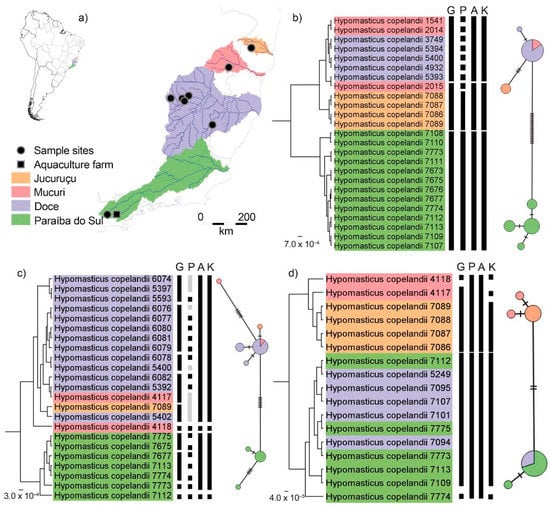 Sample collections were conducted between June 2014 and August 2016 across drainages from the Northeastern Atlantic Forest and the Paraíba do Sul freshwater ecoregions [] in the Brazilian states of Bahia, Minas Gerais, and São Paulo. Specimens of Hypomasticus copelandii were obtained from the Doce River Basin (DRB: n = 13), Mucuri River Basin (MRB: n = 3), Jucuruçu River Basin (JRB: n = 4), Paraíba do Sul River Basin (PSRB: n = 6), and from an aquaculture station of the Paraíba do Sul River Basin (Estação de Hidrobiologia e Aquicultura de Paraibuna—EHAP: n = 7) (Figure 2a). Fish specimens were collected according to Brazilian environmental laws through SISBIO/MMA permit No. 9793-1. Specimens were captured using gill nets and fins were clipped and stored on 96% ethanol at 4 °C in the Conservation Genetics Lab (LGC) at the Pontifical Catholic University of Minas Gerais (PUC Minas), Belo Horizonte, Brazil. Taxonomic identification was based on the literature [] and vouchers were deposited at the fish collection of the Museum of Natural Sciences, PUC Minas, Belo Horizonte (MCNIP).