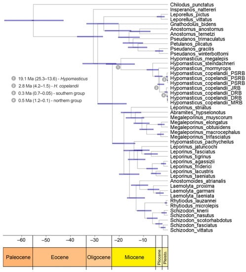 The concatenated matrix, including six genes, contained 5321 bp spanning 47 taxa (14 genera, 40 species of the Anostomidae and the root Chilodus punctatus). PartitionFinder resulted in 15 schemes and six different model combinations (Supplementary Materials). All data were further tested to investigate the occurrence of substitution saturation, and the results did not show any significant saturation (Iss < Iss.C; Supplementary Materials). The time-calibrated phylogeny estimated an Early Miocene stem age for Hypomasticus and the split of the genus with a major clade (Abramites, Anostomoides, Hypomasticus pachycheilus, Laemolyta, Leporinus, Megaleporinus, Rhytiodus, and Schizodon) at around 22.8 Ma (28.8–16.9 Ma, 95% highest posterior density, HPD) (Figure 3). The first two internal ramifications occurred in the Miocene with H. megalepis splitting from the clade composed by H. steindachneri, H. mormyrops and H. copelandii at approximately 19.1 Ma (25.3–13.6 Ma, 95% HPD). Then, H. steindachneri split from the H. mormyrops+H. copelandii clade during the Late Miocene at around 6.1 Ma (8.5–3.8 Ma, 95% HPD). The diversification of the two subclades of H. copelandii occurred during the Late Pliocene–Early Pleistocene at approximately 2.8 Ma (4.2–1.5 Ma, 95% HPD), when the lineage from the Paraíba do Sul Basin (southern group) split from the lineage from the Northeastern Atlantic Forest (northern group) (Figure 3). Within the H. copelandii, analyses found the divergence between the H. copelandii from Jucuruçu and those from Doce + Mucuri in the Middle Pleistocene at approximately 0.5 Ma (1.2–0.1 Ma, 95% HPD), and the divergence between those from Doce and Mucuri occurring in the Middle/Late Pleistocene at approximately 0.16 Ma (0.4–0.002 Ma, 95% HPD).