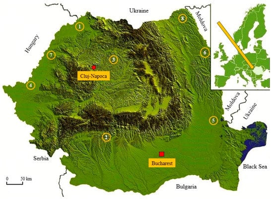 The seeds were collected from mature plus trees from eight Romanian provenances (Figure 1): (1) Galați, (2) Iași, (3) Botoșani, (4) Bihor, (5) Râmnicu Vâlcea, (6) Satu-Mare, (7) Bistrița-Năsăud and (8) Arad, corresponding to the Romanian Gene Reserved Forests and Seed Stands included in National Catalogue of Forest Genetic Resources and Forest Reproductive Materials [].