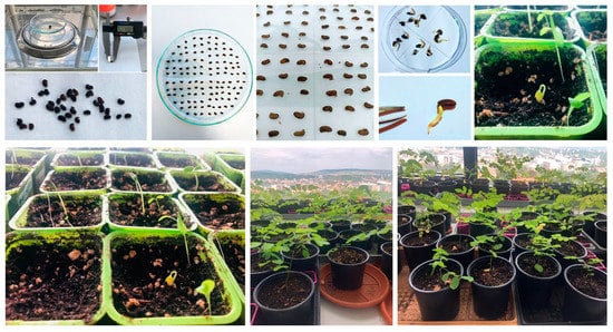 Seed analysis began in March 2021, following the established protocol and steps for the analysis of germination and seedling growth (Figure 2). Before starting the treatments, several measurements of the main phenotypic elements were performed for the seeds: height, diameter and weight. Two treatments were undertaken, each one with three concentrations, at three different temperatures. Four replicates, with 50 seeds per replicate, were used for each combination of population and treatment method. The first treatment involved water-soaked seeds and heat treatment (noted as thermal treatment), as follows: 1. seeds were soaked for 24 h in water at a temperature of 18 °C and then seeded and watered, while kept at room temperature; 2. seeds were stored at an air temperature of 45 °C for two hours (Memmet UF110 oven) and thereafter stored in a refrigerator at −20 °C for two hours and then seeded and watered; 3. seeds were stored at 60 °C for two hours, stored at −20 °C for a further two hours and then seeded and watered. The second treatment was based on sulphuric acid solution at different concentrations (50%, 70% and 90%), within which seeds were soaked for 20 min, at room temperature and light, and then seeded and watered.