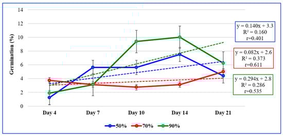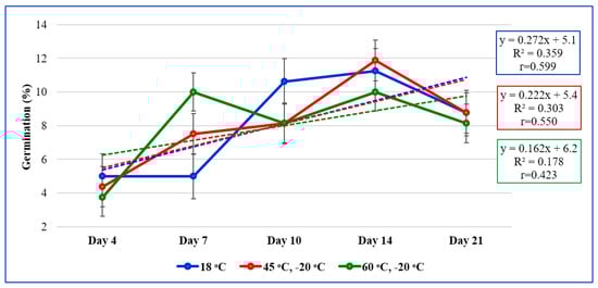The three types of thermal variation within the treatments applied to the seeds provided relatively close equations and regression lines (Figure 4). The coefficients of determination had quite low values, whereas the lowest value of the correlation coefficient was registered in the case of the treatment in which the high temperature (+60 °C) was alternated with the low temperature (−20 °C).