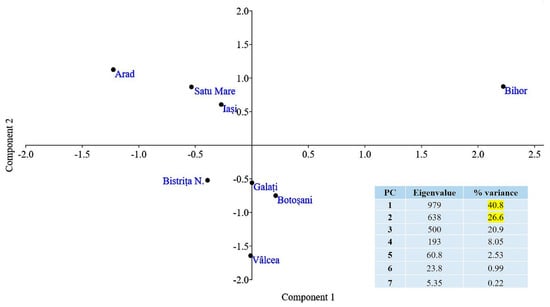 Because the data sets obtained from the combinations of provenances and treatments were large, referring to both seeds and seedlings, it was intended to reduce their size with the help of PCA but maintain all information. The principal component analysis (PCA) illustrated in Figure 5 provides a presentation of the “variability” of the variables, while retaining all the elements analysed in the current study. By identifying new variables as linear functions of those in the original data set, it was found that the first component of the PCA, respectively PC1, accounted for 40.8%, while the second component (PC2) accounted for 26.6% of the total variation observed. The values of these new variables, which successively maximize the variance, and even more are uncorrelated with each other, allowed the reduction of data sets and the summarisation of the eigenvalue problems in a descriptive rather than inferential way. Of the eight Romanian provenances, Satu-Mare and Iași form a relatively homogeneous group, but they are in opposition with Galați and Botoșani, which form another homogeneous group. The most distant provenance is Bihor, which is in a negative correlation with Bistrița Năsăud.