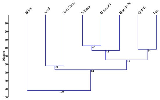 As stated in the discussion about PCA analysis, the distinct cluster of Bihor provenance is obvious. Another cluster consists of Arad and Satu-Mare, separated by a third cluster, the last with two distinct subclusters. Of these subclusters, the one located at the right end of the dendrogram consists of two provenances with certain geographical proximity (Galați and Iași). The other subcluster, which occurs at a close similarity level, contains three provenances—two grouped together at the same level of similarity or distance (Vâlcea and Botoșani) and a separate one (Bistrița Năsăud).