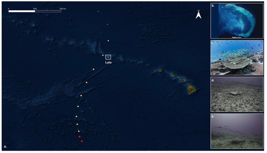 Maps of (a) the Hawaiian archipelago with the track of Walaka and (b) Lalo. The colors are showing the intensity: Categories 5 (red), 4 (yellow), 3 (green) and 2 (blue). Site photos of Rapture Reef from (c) 2017, (d) 2019 and (e) 2021 are also shown.