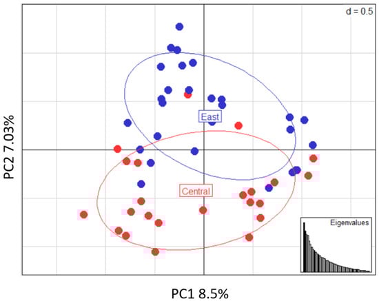 - Peakall, R.; Smouse, P.E. Genalex 6: Genetic Analysis in Excel. Population Genetic Software for Teaching and Research. Mol. Ecol. Notes 2006, 6, 288–295. [Google Scholar] [CrossRef]