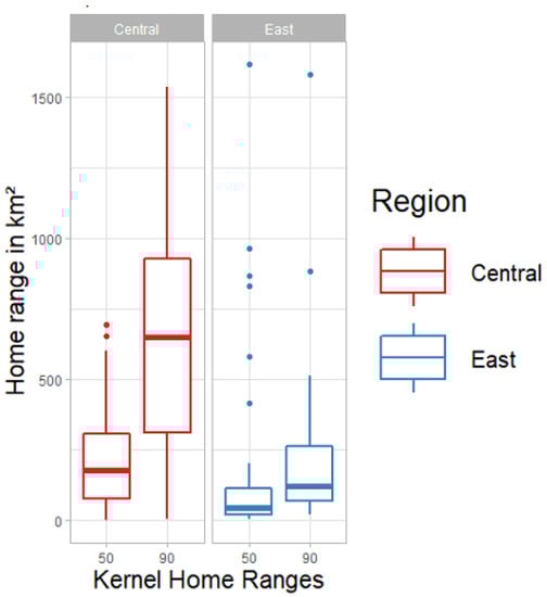 Another factor that could have influenced the difference in the average size of home ranges between the two regions is the possible difference in resource availability between the two areas. A rich habitat has been shown to lead to smaller home ranges in previous studies [80] as individuals are able to acquire sufficient amounts of food from smaller home ranges. However, there is no evidence of major differences in habitat quality between these two areas. In both study areas there are several artificial feeding sites for bears, and feeding has been shown to affect the behaviour of bears locally in several ways, e.g., individuals using the sites tend to be less mobile than those who do not [81]. Additionally, females with cubs seemed to avoid artificial feeding sites that were visited by adult males [48]. However, as feeding sites occur in both areas, they should not have had a systematic impact on the observed differences between the regions. Accordingly, home range size was not correlated with the food availability index in Scandinavian bears [76].