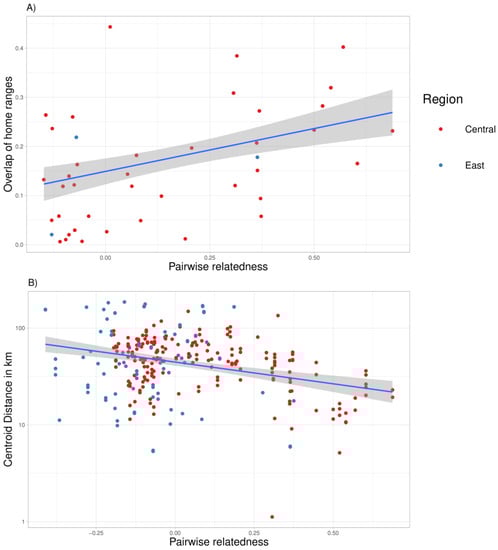 Relationship of pairwise relatedness with (A) mean home range overlap per pair, and (B) log-transformed home range centroid distance (km) in female brown bears. The blue line is the predicted mean effect of pairwise relatedness on the home range overlap, and the shaded grey area is the lower and the upper 95% confidence limit for the expected values. Dots are pairwise observations.