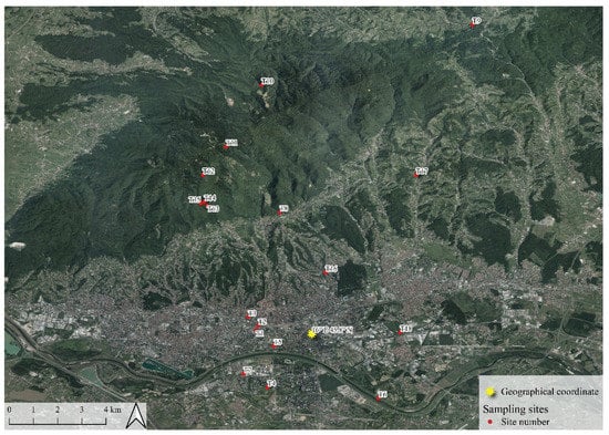 The sampling area was in the temperate zone, stretching from the alluvial floodplains of the Sava River (mean annual temperature of 10.8 °C, 880 mm of annual precipitation) to near the peak of Medvednica Mt. (mean annual temperature of 6.9 °C, 1350 mm of annual precipitation). The elevation gradient includes several climatogenic forest vegetation communities (e.g., pedunculated oak—common hornbeam; beech; beech—silver fir). Unlike Medvednica Mt., which is a nature park and mostly covered with forest vegetation, the city of Zagreb sustains significant anthropogenic impacts, with mostly human-altered habitats, including ruderal and semi-natural grasslands (http://www.bioportal.hr/gis/, acessed on 21 July 2021).