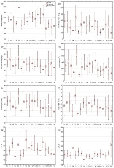 Plots of life trait mean values for populations of E. annuus distributed throughout 18 localities (T1-T18) showing standard error (SE) and standard deviation (SD). Presented life traits are (a) stem height, (b) fresh leaf mass, (c) dry leaf mass, (d) leaf area, (e) leaf length, (f) leaf width, (g) specific leaf area (SLA), (h) leaf dry matter content (LDMC).