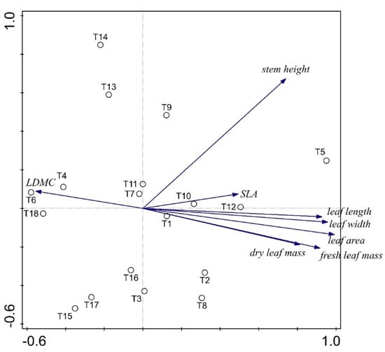 The ordination biplot of the first two ordination axes of the PCAs is shown in Figure 3. The first axis explains 88.41% of the variability, while the second axis provides an additional 11.24%, which is cumulatively 99.65% for the first two axes. On the left side of the ordination biplot, the populations have higher LDMC values compared to those on the right side. Among them, the populations sampled in the open habitat along the river embankment (T6) and in the semi-open habitat (T18) had the highest values. In addition to having the lowest LDMC values, the populations on the right part of the biplot have the highest recorded values for all other measured life traits. Populations whose individuals had the largest, longest, and widest leaves were also the ones with the heaviest leaves. The ratio of fresh to dry leaf mass was almost equal among populations. Four out of the five populations sampled in September are placed in the third quadrant because they were the shortest, with smaller and lighter leaves. Almost all populations at altitudes higher than 300 m were placed in the upper part of the diagram due to their high growth. Populations with a more pronounced competitive strategy (T4 and T18) had a high dry matter content of leaves, which were both small and light, while their stems were of medium height.