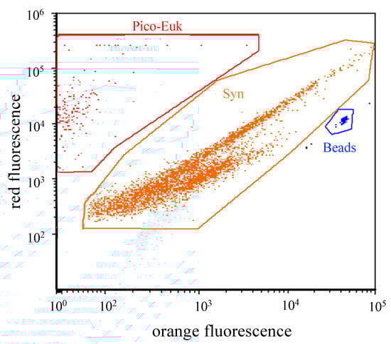 Resolution of picophytoplankton cell groups by flow cytometry. Typical red (chlorophyll a) versus orange fluorescence (phycoerythrin) cytograms exhibiting the resolution of Synechococcus spp. (Syn) and picoeukaryotes (Pico-Euk).