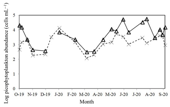 Seasonal variations of Synechococcus spp. (Δ) and picoeukaryotic (X) abundance.