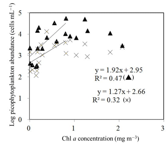 Relationship between Chl a concentrations and Synechococcus spp. (Δ) and picoeukaryotic (×) abundance. The data points of the linear regressions were below 1 mg m−3 of Chl a concentration.