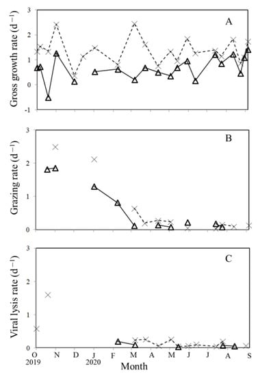 The net growth rates of Synechococcus spp. and picoeukaryotes are summarized in Table 1 and Table 2. Based on the calculations of Equations (1)–(5) from the data of Table 1 and Table 2, the gross growth rates of Synechococcus spp. and picoeukaryotes ranged from −0.39 to 1.42 d−1 and 0.38 to 2.46 d−1, respectively, throughout the study year (Figure 5A). The highest gross growth rate of Synechococcus spp. (1.42 d−1) was found in September 2020 (Figure 5A). Furthermore, the higher gross growth rate of the picoeukaryotes (2.46 d−1) was found in late March 2020, when the temperature was lower (20 °C) and dissolved inorganic nutrient concentrations were higher (NO3: 8.5 μM; PO4: 4.3 μM) during this study (Figure 2B,C and Figure 5A). Overall, the gross growth rate estimates for the picoeukaryotes were significantly higher than for Synechococcus spp. (paired t-tests, p < 0.05, n = 20).