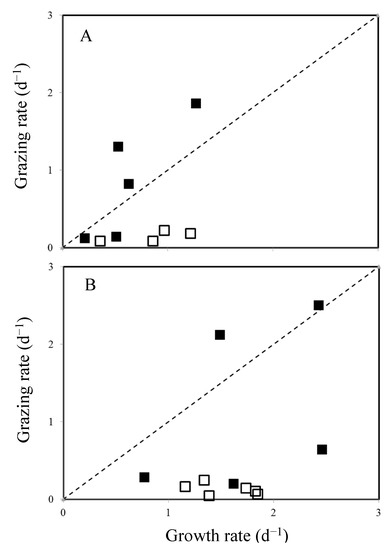 Generally, phytoplankton growth rates and grazing mortality are closely coupled [,,], which suggests a high transfer efficiency of picophytoplankton production to higher trophic levels. However, in the present study, it was interesting to note that the Synechococcus spp. and picoeukaryotic grazing mortality during the warmer period (April to September) was relatively low (Figure 5B) when a higher Synechococcus spp. growth was observed. The grazing activity may be driven by complex grazer–prey interactions, which can be modulated by the prey selectivity of the grazers (e.g., size or nutritional ratio) and this may result in mismatches between the grazers and their prey []. We plotted the relationship between the growth and grazing rates of Synechococcus spp. and picoeukaryotes; our grazing experiments showed that, in contrast, there was no response to the growth state of their prey, especially in the warmer seasons (>25 °C) (Figure 7). We were unable to assert exactly why low grazing mortality rates were often observed during this study but a variety of factors, including food selection, trophic cascades, prey switching, and dilution effects on grazers [,,], may be responsible for such low mortality in the warm seasons. Another possible explanation for the low grazing mortality during the warm seasons could be the nutrients added to these bottles in this study: the mixotrophic pigmented nanoflagellates consumed additional nutrients and lowered their feeding ability to uptake nutrients from their prey during the incubation experiments. A similar result was discussed in another nutrient enrichment experiment with Sargasso Sea populations, which also produced a marked decline in phagotrophically-active pigmented nanoflagellates after the addition of phosphorus []. Furthermore, nutrient enrichment experiments in the Mediterranean Sea [], which is oligotrophic, resulted in a significant decline in the phagotrophically-active pigmented nanoflagellates in the treatments. All of the evidence strongly supports our results that were obtained with natural pigmented nanoflagellate assemblages, suggesting that these mixotrophic nanoflagellates that inhabit these oligotrophic coastal waters could use their feeding capability to supplement nutrients but that they would take up nutrients primarily from a dissolved pool with high nutrient concentrations.