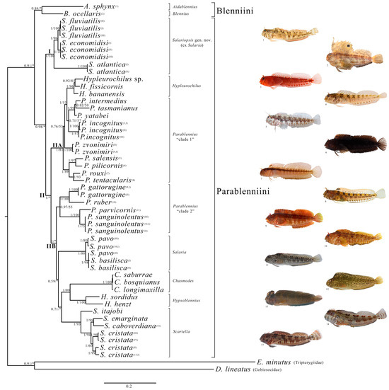 Bayesian phylogram of the studied Blenniidae samples based on the concatenated mtDNA and nuDNA dataset. Node statistical support is reported as nodal posterior probabilities (Bayesian Inference of phylogeny, BI)/bootstrap values (maximum likelihood, ML). Asterisks indicate a bootstrap support value lower than 50. Square brackets group the samples according to the current taxonomy. Arabic numbers in brackets refer to the blennies’ images attached next to the phylogram. Roman numbers in brackets refer to specimens listed in Table 1. (I), freshwater Salariopsis gen. nov. (ex Salaria) clade; (II), marine Parablenniini clade; (IIA), Hypleurochilus and Parablennius “clade 1” subclades; (IIB), Parablennius “clade 2”, Salaria, Chasmodes, Hypsoblennius and Scartella subclades.