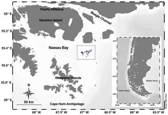 The study was conducted in Nassau Bay (55°41′67″ S; 67°66′67″ W), located south of Navarino Island and north of Cape Horn Archipelago, Chile (Figure 1). The bay is about 100 km wide, with a shallow water environment less than 70 m depth. The water column presents a homogeneous vertical structure with a mean temperature of 6.5 °C, mean oxygen content of 6.5 mL L−1, and salinity of 32.5 [34]. The weather is characterized by a temperate-cold climate with a minimum temperature of 5 °C and a maximum of 10 °C [35].