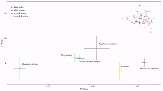Bayesian isotopic mixing models were performed by using the SIMMR package from R software, version 4.0.2 [57], first to create a biplot of carbon (δ13C) and nitrogen (δ15N) values from individual southern king crabs grouped by sex and maturity stages and the potential food sources and second, to estimate the proportional contribution of macroalgae and sediment as basal carbon sources to the southern king crab population across sex and maturity stage. The SIMMR package uses the Markov Chain Monte Carlo algorithm to estimate parameters from observed data and user-specified prior distributions [58]. This approach allows the user to incorporate uncertainty in trophic enrichment factors, sources, and mixtures [58]. The trophic enrichment factor (TEF) used for computing the mixing model was 2.3‰ (SE = 0.28) for δ15N and 0.4‰ (SE = 0.17) for δ13C for aquatic consumers [59].
