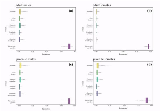 The Bayesian mixing models showed that the predominant basal carbon source that contributes to the diet of L. santolla population was the brown macroalgae Macrocystis pyrifera, with average values of 89.6% for males, 96.5% for females, 88.8% for adults, and 88.2% for late juveniles. The second carbon source contributing to L. santolla was the red algae Porphyra columbina, showing average values of 2.5% for males, 0.8% for females, 0.26% for adults, and 0.28% for late juveniles. The proportional contribution of sediment was 0.28% for males, 0.10% for females, 0.31% for adults, and 0.32% for late juveniles. The carbon primary sources such as macroalgae species Gigartina skottsbergii, Gracilaria chilensis, and Ulva lactuca contributed less than 0.20% to the nutrition of L. santolla (Figure 3).