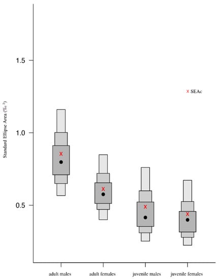 To determine the size of isotopic niches of L. santolla, their variability across sex and maturity stage and overlap, carbon and nitrogen stable isotope data of adult males/females and late juvenile males/females were used to calculate the standard ellipse area (SEA) and corrected for small sample size (SEAc) with the Stable Isotope Bayesian Ellipses (SIBER) package in R [61]. The SEAc was set to contain 40% of isotopic observations of each group [62], along with the traditional standard convex hull which represents the isotopic total area (TA) occupied by individuals [30].
