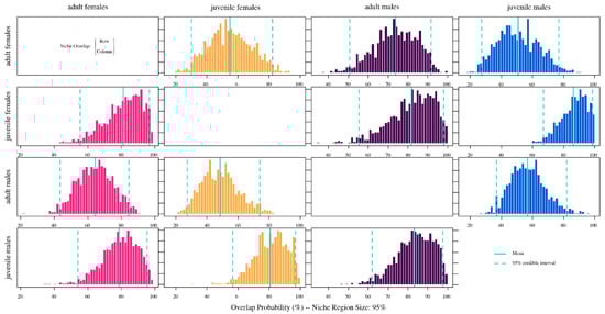 The niche overlap estimated with SIBER showed a high degree of overlap between late juvenile males and females (34.8%), while less overlap (<3%) was found for the rest of groups. The observed δ13C of adult females were more enriched compared to late juvenile females, resulting in the lowest probability of niche overlap (0.8%) (Figure 4).