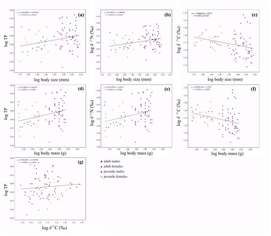 Relationships between: (a) body size vs. TP, (b) body size vs. δ15N, (c) body mass vs. δ13C, (d) body mass vs. TP, (e) body mass vs. δ15N, (f) body mass vs. δ13C, and (g) δ13C vs. TP for all individuals of the southern king crab Lithodes santolla, Nassau Bay, Cape Horn.