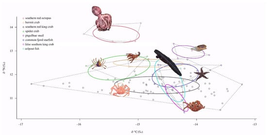 With a TEF of 2.3‰, the estimated trophic position (TPs) for the associated fauna varied from 2.1 for the sponge Haliclona sp. positioned as a consumer of the first trophic level, to 4.2 for southern octopus as the highest predator in the benthic food web (Table 6). The community’s isotopic niches revealed at least four trophic levels where the southern king crab was found positioned as an intermediate level consumer (trophic level = ~3).