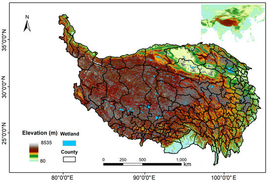 The Qinghai-Tibet Plateau lies in the southwest of China and includes all regions of Tibet Autonomous Region and Qinghai Province, as well as parts of Xinjiang Uygur Autonomous Region, Gansu Province, Sichuan Province, and Yunnan Province [1]. This region is the largest and highest plateau in the world, with an average altitude of more than 4000 m above sea level [2]. Covering an area of about 2.5 × 106 km2, the Qinghai-Tibet Plateau is surrounded by a series of mountains, such as the Hengduan Mountains, the Himalayas, the Qilian Mountains, and the Karakoram mountains [3,4]. Known as the water tower of Asia, with tens of thousands of glaciers, it is the largest freshwater reserve in the world outside the polar regions [5]. It is also the birthplace of the Yangtze River, the Yellow River, Lancang River, and other important rivers, and plays an important role in the ecological security of the downstream water system [1].