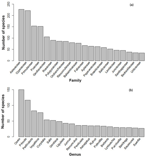 Asteraceae, Cyperaceae, Primulaceae, Poaceae, Gentianaceae, and Rosaceae account for a large number of species. The dominance of these families is consistent with the research results of different research geographical units (provinces, wetlands, and watersheds) on the Qinghai-Tibet Plateau [14,15,47]. The explanation is that these families are all plant macro-families widely distributed throughout the world, such as Asteraceae and Poaceae, spread all over the world from the tropics to the poles [48,49]. Many studies have shown that the Qinghai-Tibet Plateau is the origin, distribution, and differentiation center of many species. These families and genera are highly diverse in the Qinghai-Tibet Plateau, genera Gentiana, Pedicularis, Ligularia, Primula, etc. [50,51,52].