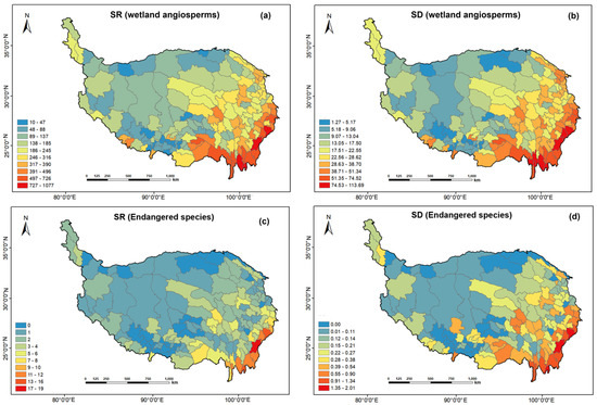 Distribution pattern of species richness (SR) and species density (SD) of wetland angiosperms (including endangered species) in the Qinghai-Tibet Plateau, projected in ArcGIS 10.2. (a,b) wetland angiosperms Species Richness (SR) and Species Density (SD); (c,d) Endangered wetland angiosperms Species Richness (SR) and Species Density (SD).