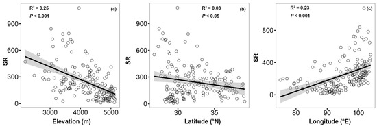 Elevation (a), latitude (b), and longitude (c) patterns of wetland angiosperms in the Qinghai-Tibet Plateau. LM model is used to fit the data, and the shaded areas represent the 95% confidence interval (N = 166).