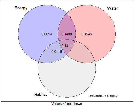 Variance partitioning (proportions) of species richness for Wetland angiosperms into the independent effects of energy, water, and habitat variables, and their overlaps.