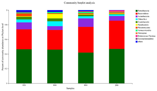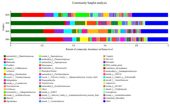 - With the Reducing carbon input treatment, the Chao1 index, OTU number, and Shannon index of the bacterial community in large-scale biofloc shrimp culturing facilities increased significantly. The number of OTUs of B80 (572.36 ± 13.26) was significantly higher than that of B60 (489.69 ± 12.97), B40 (423.35 ± 18.46) and B20 (407.67 ± 15.65) (p < 0.05). The Chao1 index of B80 (768.58 ± 36.96) was significantly higher than that of B60 (646.8 ± 52.53), B40 (569.7 ± 46.53) and B20 (516.3 ± 21.35) (p < 0.05). The Shannon index of B80 (5.63 ± 0.16) was higher than that of B60 (4.85 ± 0.13), B40 (4.68 ± 0.21) and B20 (3.65 ± 0.22), with significant difference (p < 0.05). The development of community structure in four periods had different responses to different microecological environments, and there was a strong degree of nitrification process in the B80 and B60 periods. At the end of the experiment, the domestication formed a micro-ecosystem with Proteobacteria as the carrier (46.98% ± 15.82%), Chloroflexi as the skeleton (2.2% ± 0.36%), Nitrospirae (1.35% ± 0.26%) as the main water treatment functional bacteria, and other bacteria as auxiliary nitrogen and phosphorus removal; At the genus level, unclassified_f_Rhodobacteracea (22.97% ± 3.82%), Ruegeria (10.35% ± 1.26%), muricauda (5.73% ± 0.61%), Algoriphagus (3.75% ± 0.85%) and Nitrospira (1.56% ± 0.56%) were the dominant bacteria. Under the synergy of the above bacteria, bioflocs can effectively regulate and control water quality, maintain a low level of ammonia nitrogen and nitrite nitrogen without drainage, and maintain a relatively stable shrimp culturing ecosystem.