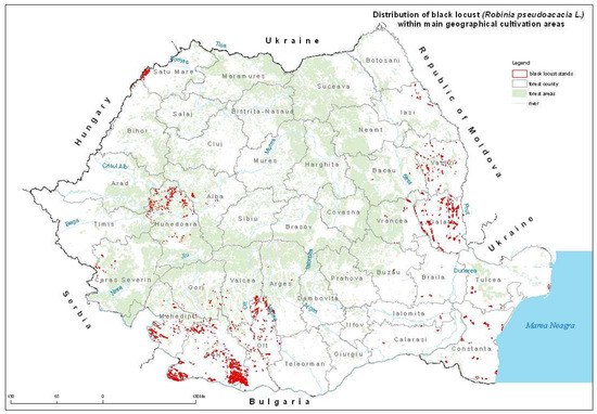 Geographically, black locust stands occupy about 5% of the national forested area (250,000 ha), concentrated in the southwest, west, and in the east of the country [