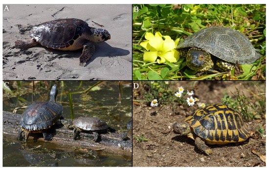 - Ernst, C.H.; Lovich, J.E. Turtles of the United States and Canada, Second Edition; JHU Press: Baltimore, MD, USA, 2009. [Google Scholar]