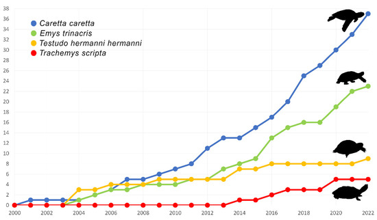 Cumulative curves describing the trend of published scientific papers, between 2000 and the present day, were generated for the three native species analysed in the present study (i.e., Emys trinacris, Testudo hermanni hermanni, and Caretta caretta) and the single non-native species (Trachemys scripta) based on bibliographic queries using the Scopus website (https://www.scopus.com/, accessed on 26 August 2022). The parameters used for gathering such information were based using the following query structure (searching within article title, abstract, and keywords): “scientific name of the species (AND) Sicil*” (e.g., Caretta caretta (AND) Sicil*). Since Emys trinacris was described in 2005, and Sicilian pond turtle populations were referred to Emys orbicularis (Linnaeus, 1758) in the previous literature, a further query using “Emys orbicularis (AND) Sicil*” was carried out for the time span 2000–2005. In the frame of this work, we followed the nomenclature and taxa authorships reported by Corti et al. [22]. However, the reader should be aware that Joyce et al. [23,24] provide alternative clade names of the taxa.
