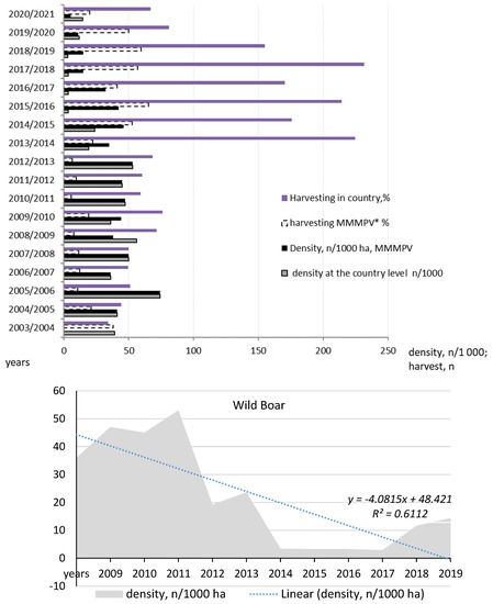 Changes in wild boar harvesting and density in the model territory and entire country. Note: MMMPV is the abbreviation of the model area.