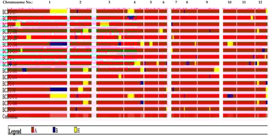 All linkage groups across 12 chromosomes of the 16 improved selected rice lines. Note: Red lines represent homozygous regions for recurrent parent (Putra-1) alleles, blue lines represent homozygous regions for donor parent (IRBB60) alleles while yellow lines represent heterozygous regions.