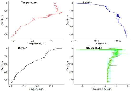 Data were analyzed for the hydrophysical parameters of the environment, measured using the CTD-rosette equipment package [57]. The average value of the parameters in the sampling place are presented: temperature: − 0.54 °C; salinity: 34.49‰; oxygen: 10.51 mg/L; and chlorophyll A: 0.47 µg/L. The detailed dynamics of the environmental factors is shown in Figure 1.