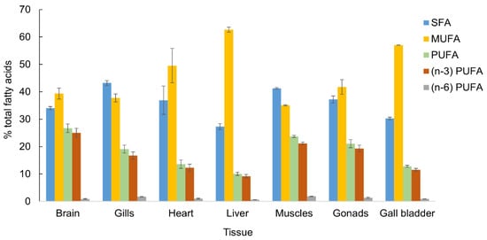 The main FAs in the liver were 18:1(n − 9), 16:1(n − 7), 16:0, 20:0, 20:5(n − 3), 18:0, 14:0, 18:1(n − 7), 18:0, and 22:6(n − 3). MUFA were the prevalent FAs and accounted 62.7% (Figure 2). Among the MUFAs, the content of 16:1(n − 7) (23.4%) and 18:1(n − 9) (33.9% of total FAs) was the highest. SFAs followed the MUFAs and were 27.3%. The content of 14:0 (2.7%) and 16:0 (11.6%) FAs were significantly lower than that in the muscles and gills. The PUFA content only accounted for 10.1%; 9.2% was detected for n − 3 PUFAs due to EPA (4.8%) and DHA (2.7%). The ratio of essential FA 20:5(n − 3)/22:6(n − 3) was 1.8, and the ratio of 16:0/18:1(n − 9) was 0.3.