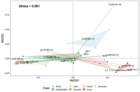 To visualize the differences in the FA content in the studied organs of P. antarcticum, the non-metric multidimensional scaling (NMDS) method was used as an indirect gradient analysis approach, which produces an ordination based on a distance or dissimilarity matrix (Figure 3). The NMDS method is used to facilitate recognition and the interpretation of patterns and differences among groups. The highest content of the major FA 22:6(n − 3) and minor FA 24:1(n − 9) was in the brain (p-value = 0.001) (Figure 3). Fields of gills and muscles are presented in the same part of the graph and differed in the higher content of minor food-derived FAs: 18:2(n − 6), 18:3(n − 3), 18:4(n − 3) and 14:0 FA. The liver differed in the content of 16:1(n − 7) and 18:1(n − 9) FAs. By calculating the Spearman correlation coefficient between the two matrices (with the original data and the chi-square matrix from the original data) for all options, the best metric was set at “man” (Manhattan distances). The measure of discrepancies between the original and simulated distance matrices (value “Stress”) was high at 0.061.
