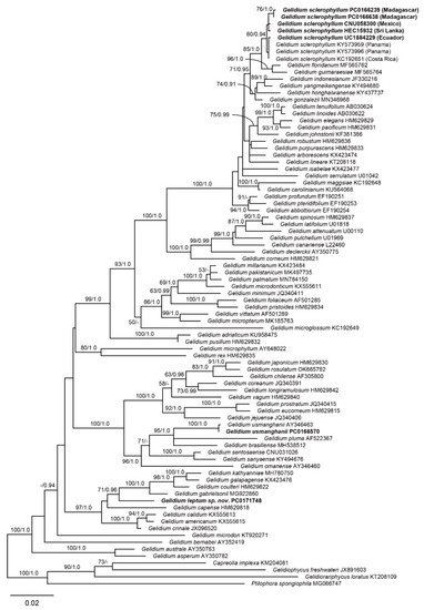- Boo, G.H.; Hughey, J.R. Phylogenomics and multigene phylogenies decipher two new cryptic marine algae from California, Gelidium gabrielsonii and G. kathyanniae (Gelidiales, Rhodophyta). J. Phycol. 2019, 55, 160–172. [Google Scholar] [CrossRef]