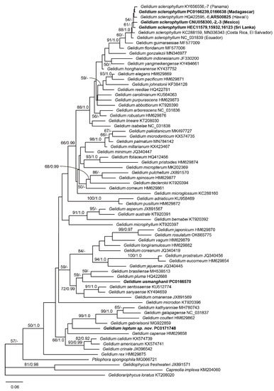- Freshwater, D.W.; Shahnaz, L. Phylogenetic relationships of Pakistan Gelidium (Gelidiales, Rhodophyta) species with recognition of Gelidium pakistanicum stat. nov. Bot. Mar. 2019, 62, 141–147. [Google Scholar] [CrossRef]