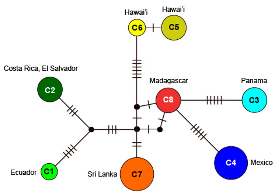 - Leigh, J.W.; Bryant, D. PopART: Full-feature software for haplotype network construction. Methods Ecol. Evol. 2015, 6, 1110–1116. [Google Scholar] [CrossRef]