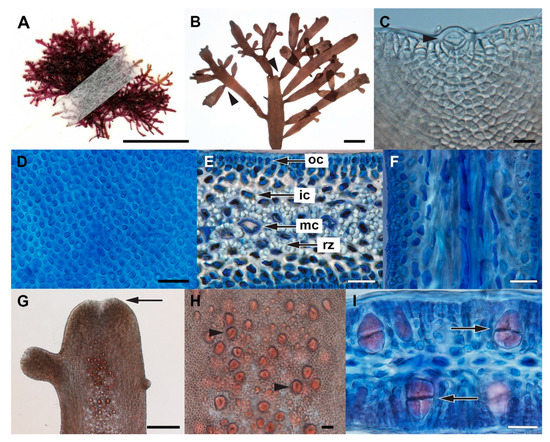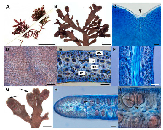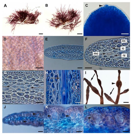 - Boo, G.H.; Le Gall, L.; Rousseau, F.; De Reviers, B.; Coppejans, E.; Anderson, R.; Boo, S.M. Phylogenetic relationships and morphology of Gelidiella (Gelidiales, Rhodophyta) from Madagascar with a description of Gelidiella incrassata sp. nov. Cryptogam. Algol. 2015, 36, 219–237. [Google Scholar] [CrossRef]