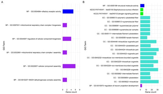 Enrichment analysis for the Caqueteño Creole cattle, where blue bars represent molecular functions, purple bars biological processes, and turquoise bars refer to cellular components. (A) Group 1 and (B) Group 2.