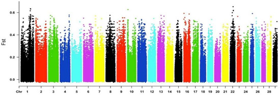 The fixation index (Fst) is one of the most commonly used parameters to study the genetic differentiation between populations. This index is initially defined in terms of the two-gamete union correlations described by Wright [28]. The Fst was performed via VCFtools software using the --weir-fst-pop parameter to specify each population. The SNP cutoff was defined in three standard deviations above the mean for each autosome.